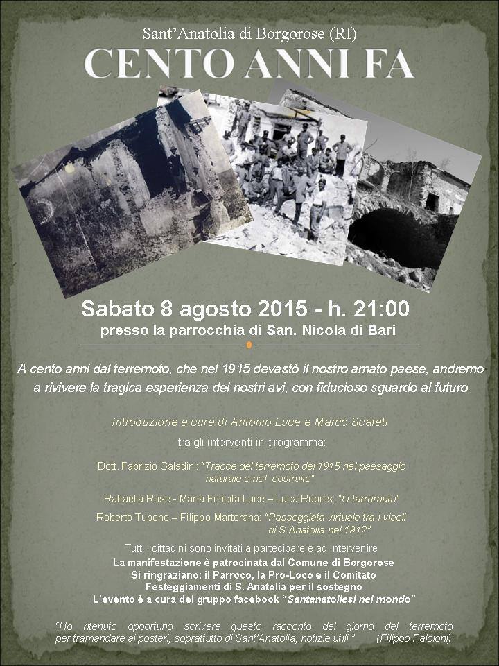 Sabato 8 agosto 2015, nella frazione di Sant'Anatolia del comune di Borgorose (RI), si è svolta la seconda edizione della commemorazione del centenario del terremoto del 1915. La manifestazione è stata intitolata "Cento anni fa" ed è stata caratterizzata dall'ampio uso di tecnologie multimediali.