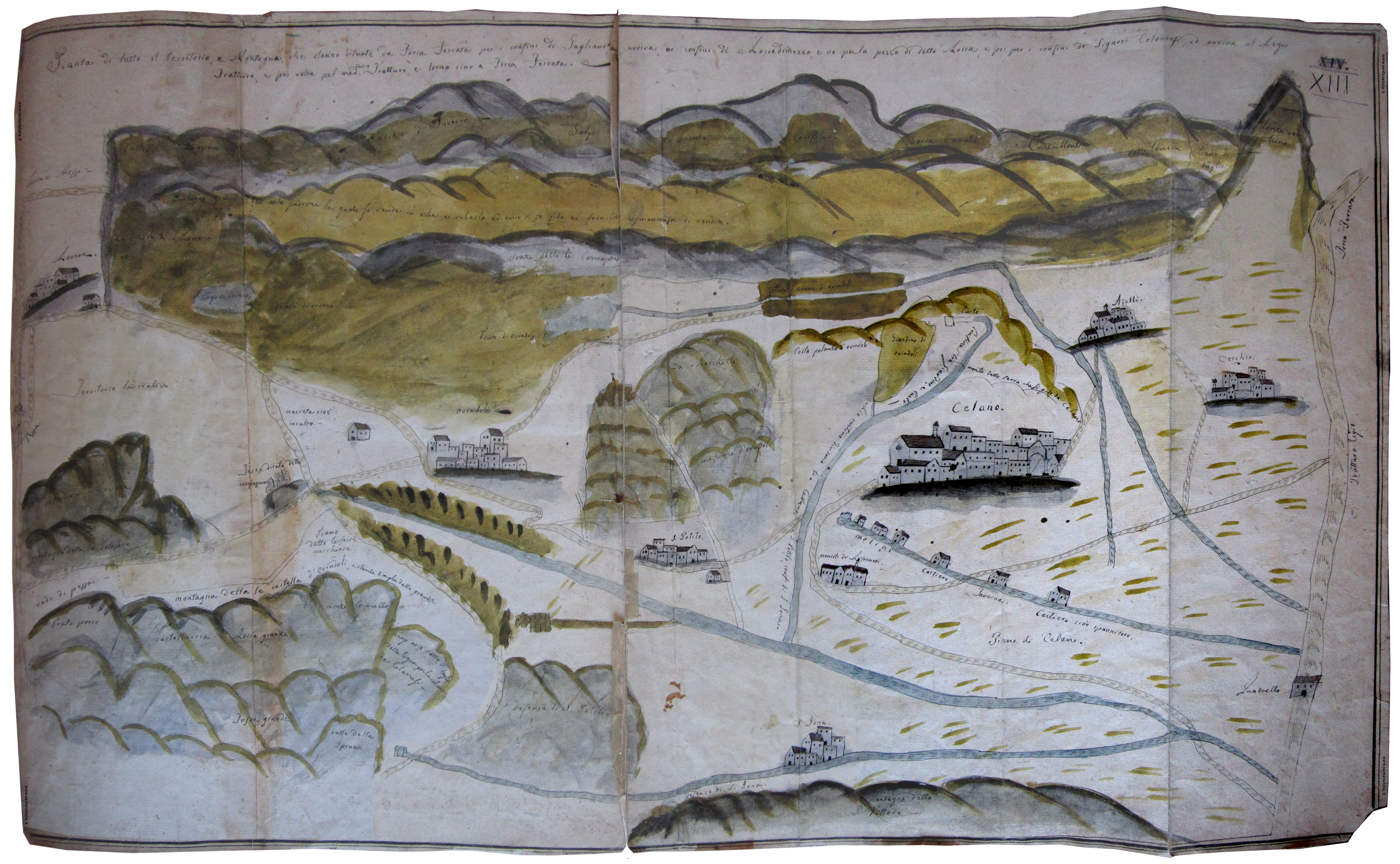 Archivio di Stato di Napoli - Ministero dell'Interno - 2° inventario - Fascio 1846 Bis - Affari Demaniali e Feudali - 1811-1814 - Pianta di tutto il territorio e Montagna, che stanno situate da Forca Ferrata, per i confini di Gagliano, arriva ai confini di Roccadimezzo, e va per la pezza di detta Rocca, e poi per i confini de' signori Colonnesi ed arriva al Regio Tratturo, e poi volta pel medesimo Tratturo, e torna sino a Forca Ferrata - Contenitore 1846 - Unità cartografica XIII - Dimensioni (altezza x larghezza in mm): 490 x 745 - Autore: sconosciuto - La carta non ha riferimenti cronologici, tranne il faldone dov'è contenuta che si riferisce agli anni 1811-1814 ma che in realtà contiene anche carte del 1750. Quindi la data 1800 è una ipotesi che indica il periodo approssimativo - Immagine fotografata da Roberto Tupone in data 03.07.2013