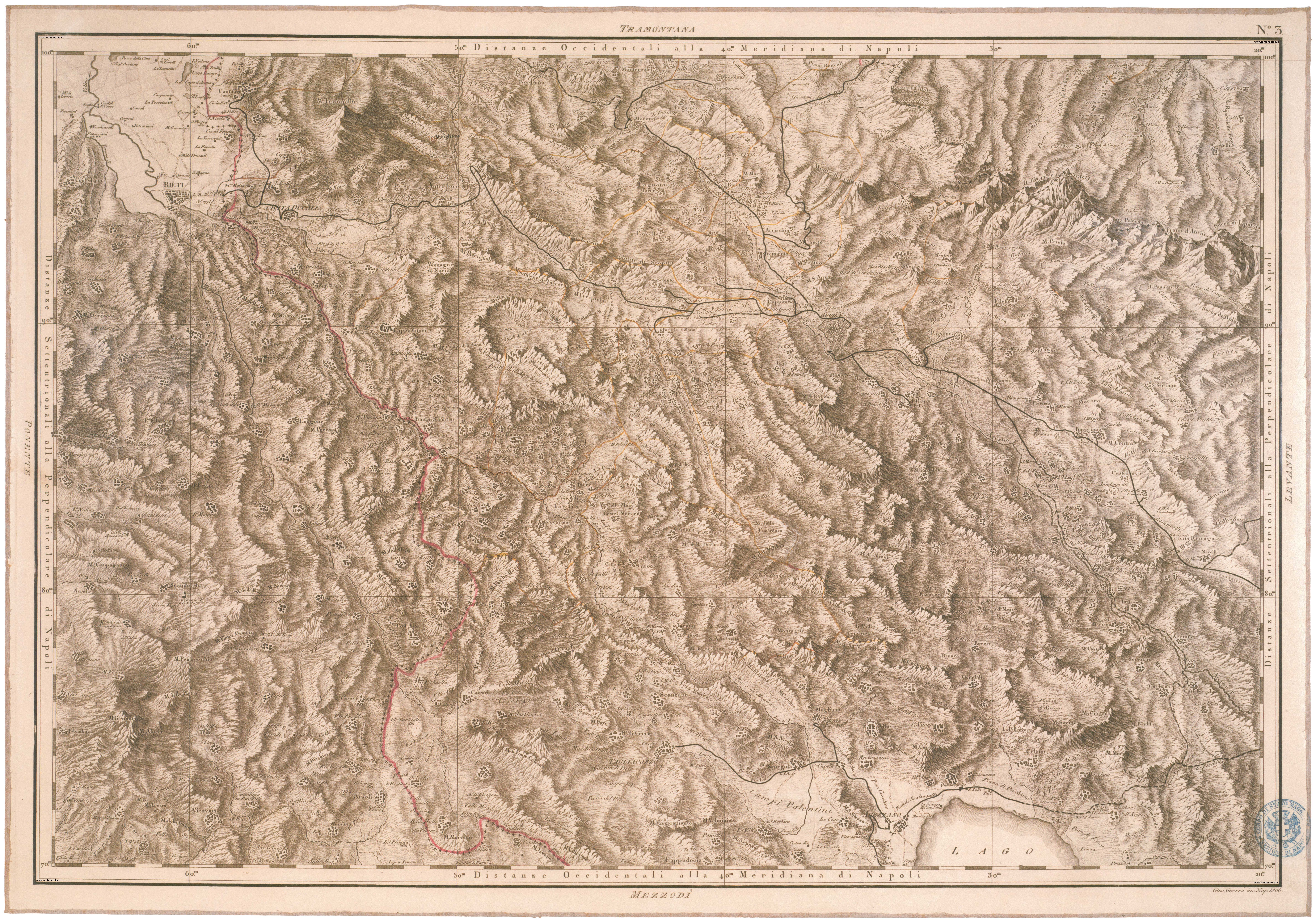 Tavolette 1:126.000 per la Carta del Regno di Napoli - foglio 3 - La carta originale si trova presso l'Istituto Geografico Militare Italiano a Firenze - Il foglio originale è rettangolare della dimensione di cm. 74 x 49, con orografia rappresentata artisticamente mediante un sistema di ombreggiatura prospettica ottenuta col tratteggio - Per quanto non sufficientemente esatto questo atlante "costituì un progresso veramente grandissimo nella cartografia del Reame, che per esso veniva ad essere dotato di una rappresentazione a grande scala artistica ed evidente del suo territorio quale nessun'altra parte d'Italia poteva, sino allora, vantare, onde a buon diritto il Rizzi-Zannoni ne riscosse nuova ragione di ammirazione e di plauso" - Scansione a cura di Roberto Tupone