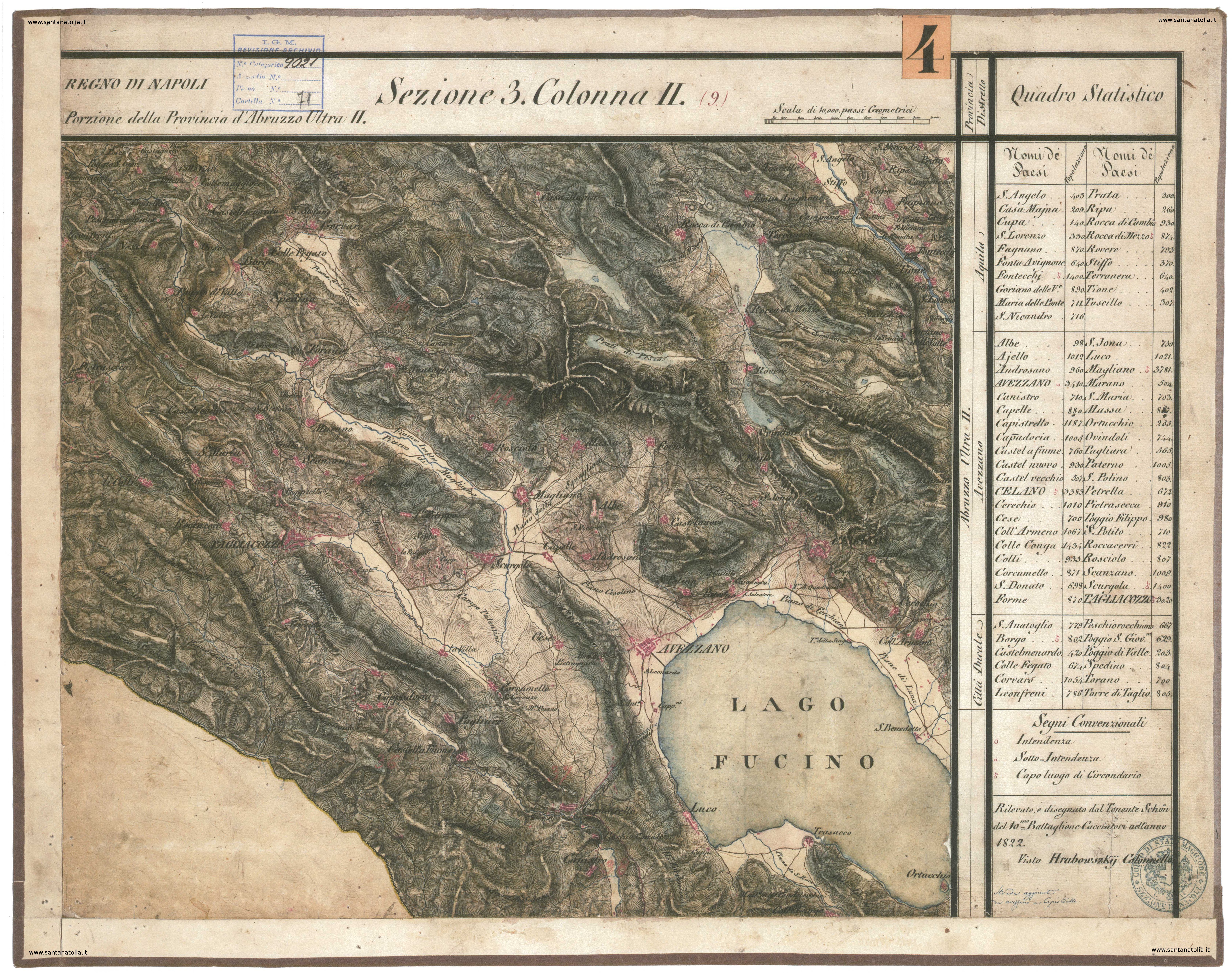 Tavolette 1:103.680 - Regno di Napoli, porzione della Provincia d'Abruzzo Ultra II - Sezione 3 Colonna II (9) - Con quadro statistico che riporta la divisione della provincia, i comuni, le frazioni e il numero degli abitanti - La carta originale si trova presso l'Istituto Geografico Militare Italiano a Firenze - Il foglio è rettangolare della dimensione di cm. 41 x 36 - Trattasi della revisione della carta di Rizzi Zannoni del 1808, eseguita da ufficiali austriaci dell'esercito di occupazione nel Regno di Napoli dopo gli avvenimenti del 1821. La carta rappresenta l'orografia col tratteggio a luce zenitale: distingue gli abitati in base alla loro importanza amministrativa, le strade in postali (ghiaiate, da eseguirsi, naturali), comunali (rotabili, rotabili non in tutti i tempi), sentieri (per cavalli, per pedoni), ponti in pietra, in legno, di battelli, guadi, ecc. Sono distinti a colori vigneti, prati, boschi, oliveti. Sono infine indicati i confini di stato e di provincia. - Scansione a cura di Roberto Tupone