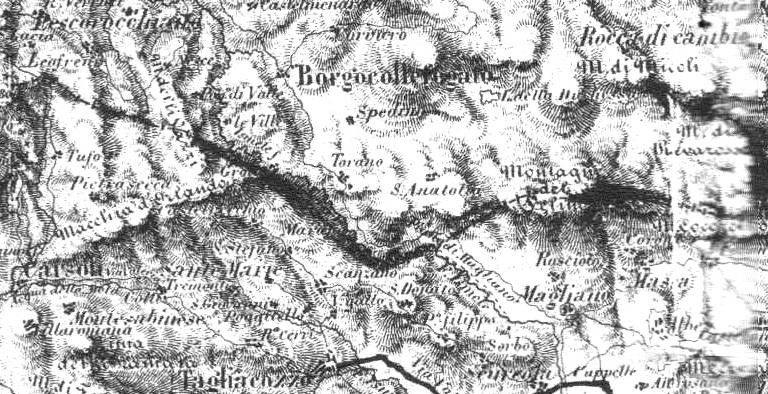 Carta topografica del 1853 dell'Abruzzo Ulteriore II - con dettaglio del numero degli abitanti per singola frazione e comune - Particolare della zona di S.Anatolia - Immagine scansionata da Roberto Tupone