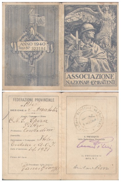 Spera Pietro Antonio (figlio di Filippo e Giovanna Piccinelli) - Anno 1940 - Tessera dell'Associazione Nazionale Combattenti - 1° iscrizione 1/1/1921 - Originale in mio possesso