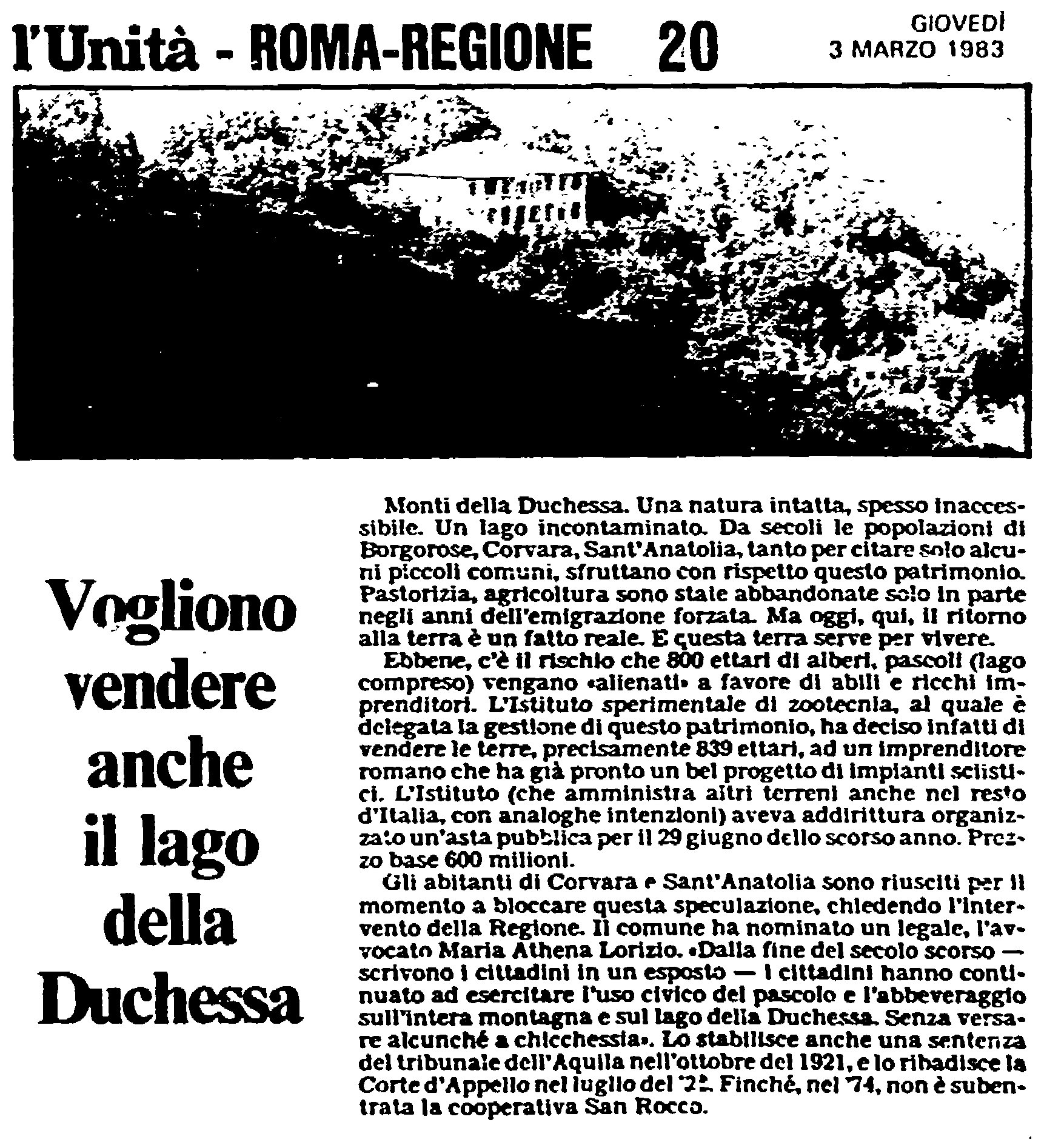 L'Unità del 3 marzo 1983 - Vogliono vendere anche il lago della Duchessa