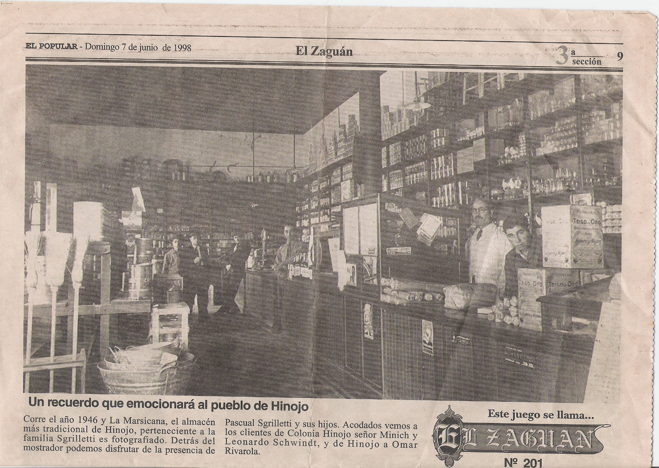 Parte 1 - Lina Sgrilletti (di Pasquale Sgrilletti e Francesca Anatolia Laurini) - (documento datato 7 giugno 1998) - Documento gentilmente inviato da Eduardo Sgrilletti (di Mario Simone e Blanca Esther Pascua) dall'Argentina che scrive: "Copia de página del Diario EL POPULAR de Olavarría del 7 de Junio de 1998, con motivo del cierre del comercio "LA MARSICANA" (1918 - 1998): Relato de LINA SGRILLETTI DE PAGELLA (en dos partes)."