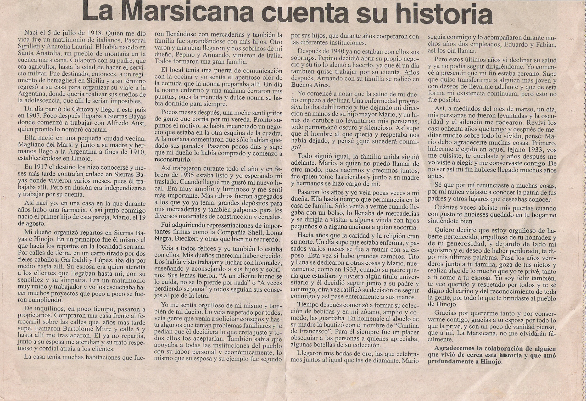 Parte 2 - Lina Sgrilletti (di Pasquale Sgrilletti e Francesca Anatolia Laurini) - (documento datato 7 giugno 1998) - Documento gentilmente inviato da Eduardo Sgrilletti (di Mario Simone e Blanca Esther Pascua) dall'Argentina che scrive: "Copia de página del Diario EL POPULAR de Olavarría del 7 de Junio de 1998, con motivo del cierre del comercio "LA MARSICANA" (1918 - 1998): Relato de LINA SGRILLETTI DE PAGELLA (en dos partes)."