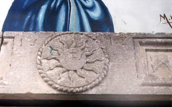 Particolare del portale - Simbolo di Gesù IHS e probabile data 1518 - Fotografia di Roberto Tupone 1990 - http://it.wikipedia.org/wiki/IHS