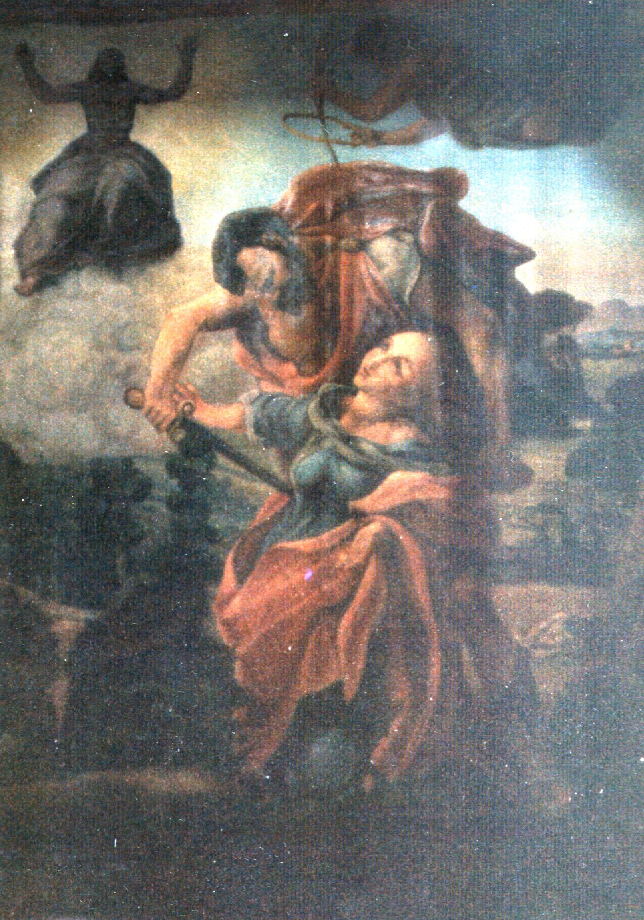 Tela di grandezza approssimativa di metri 6 x 4 - Il martirio di S. Anatolia - Il Centurione romano trafigge Anatolia con la spada - in alto sulla sinistra Gesù alza le mani e sulla destra un angelo porta alla santa i suoi attributi, la corona e la palma del martirio - 24/9/1990 - Fotografia di Roberto Tupone