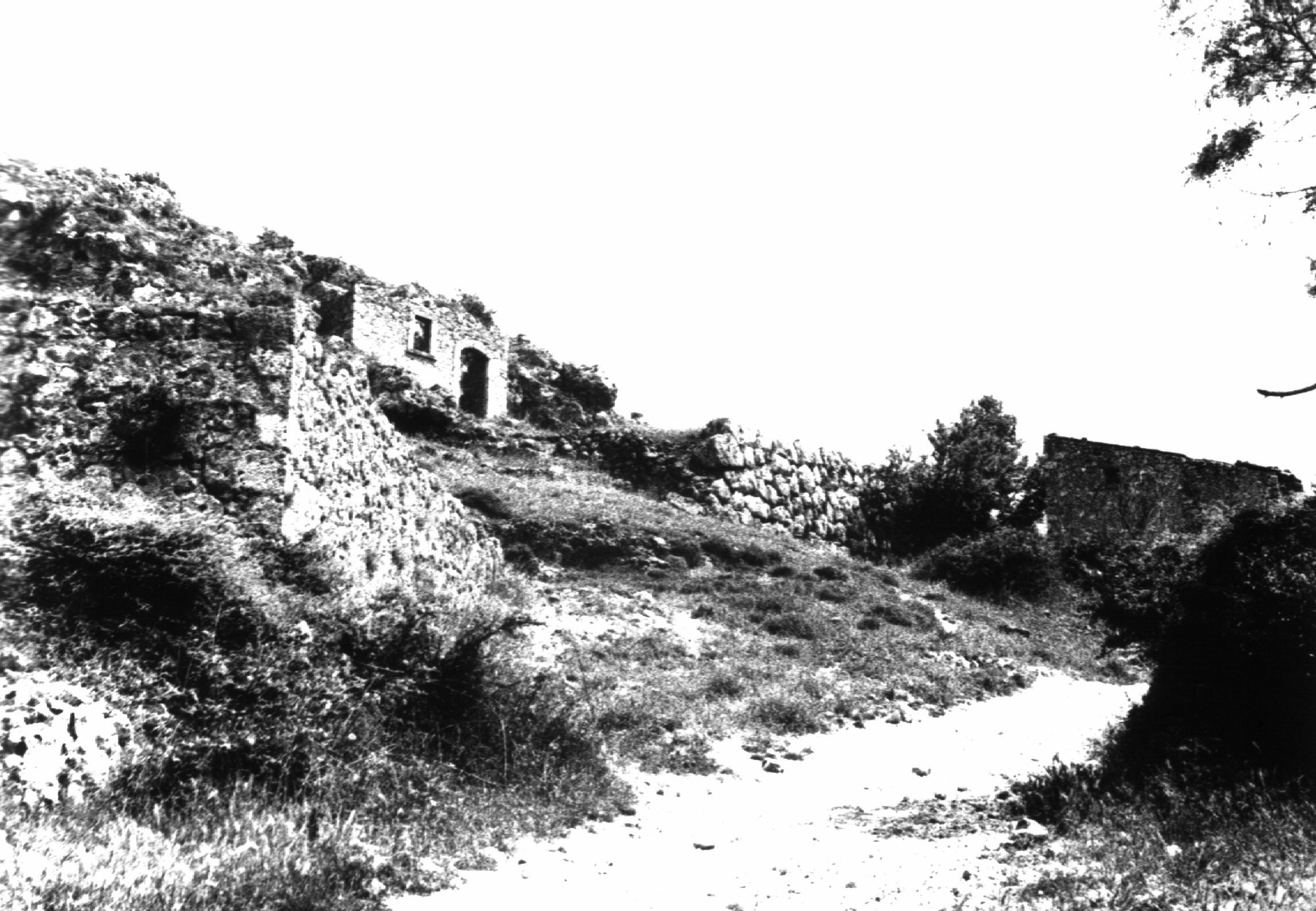 Muraglia antica con pietre ciclopiche a Sant'Anatolia (epoca romana o antecedente) A sinistra della muraglia si nota una piccola grotta e sopra il piccolo rudere senza tetto di incerto utilizzo - Fotografia di Roberto Tupone 03/06/1985