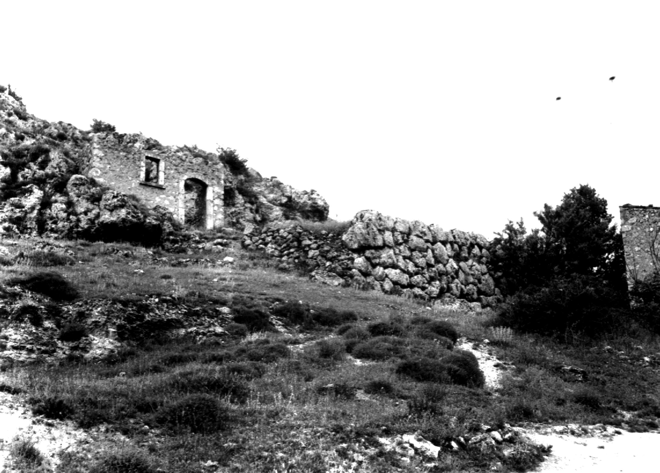 Muraglia antica con pietre ciclopiche a Sant'Anatolia (epoca romana o antecedente) A sinistra della muraglia si nota una piccola grotta e sopra il piccolo rudere senza tetto di incerto utilizzo - Fotografia di Roberto Tupone 03/06/1985