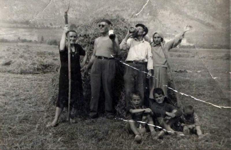 1951 Vallata di S. Biagio: braccianti agricoli alla dipendenza del Barone Masciarelli - Da sx in alto: Clara Carotta (figlia) e Giovanni Carotta (padre) (di Rocchette - Piacenza). Adolfo Cervetti (di Modena o Parma) e la moglie Antonietta (di Marano). In basso da sx: tre figli di Ettore Minicucci (di Magliano dei Marsi) e di Clara Carotta, Giorgio, Nino e Antonio Minicucci - Fotografia gentilmente inviata da Candida Amanzi