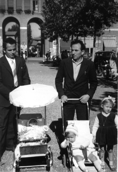 1959 - 25 ottobre - Roma, quartiere Garbatella - Raffaele (lello) Di Giorgio con Giuliana in carrozzina e Giuseppe Tupone con Alfredo in carrozzina e in piedi Gabriella Tupone