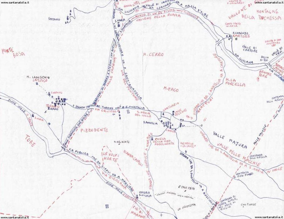 In blu i nomi e le vie tratti dalla carta del 1881. In rosso i nomi e le vie attuali rilevati dalle carte militari o direttamente dagli abitanti del luogo - Immagine disegnata da Roberto Tupone nel 1990